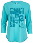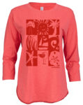5.9 oz, 100% Cotton Slub Jersey. Features include a scoop neck, ¾ length sleeve, curved hi-lo hem line (back is longer than the front). Our Slub fabric is thicker with slightly raised threads giving the fabric a textured look and feel.  Tear away label. Ladies Relaxed Loose fit.